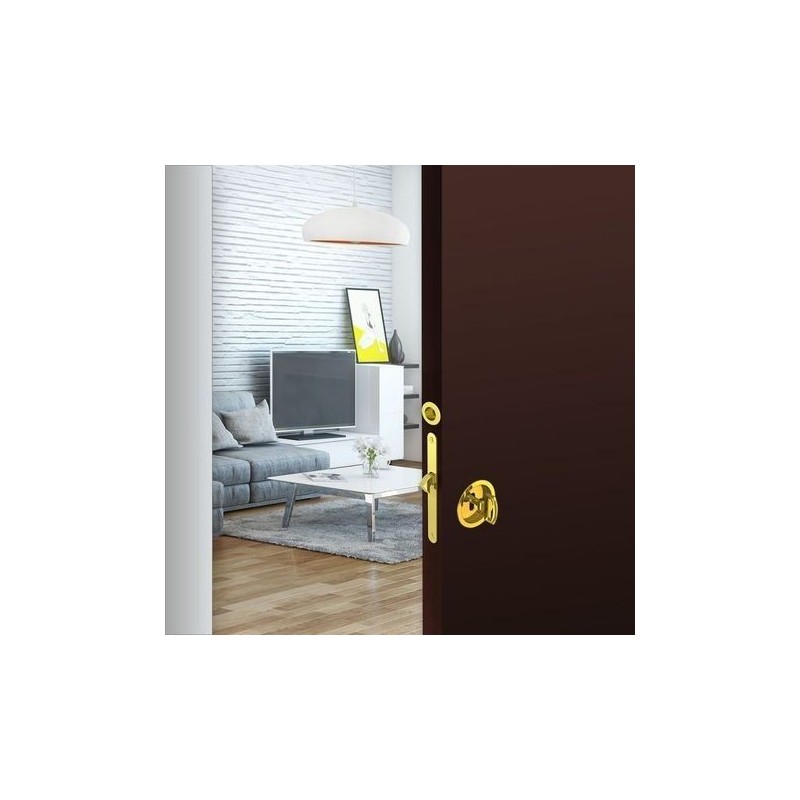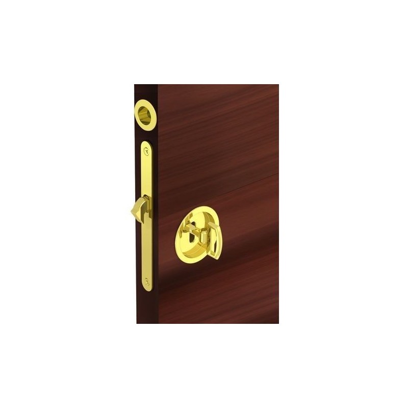 Serrure à crochet à encastrer avec poignées rondes et tire-doigt pour porte coulissante. Pour porte d'épaisseur 40 mm. KIT SERRURE À CLÉ POUR PORTE COULISSANTE DORÉ FROSIO BORTOLOEn acier finition doré.