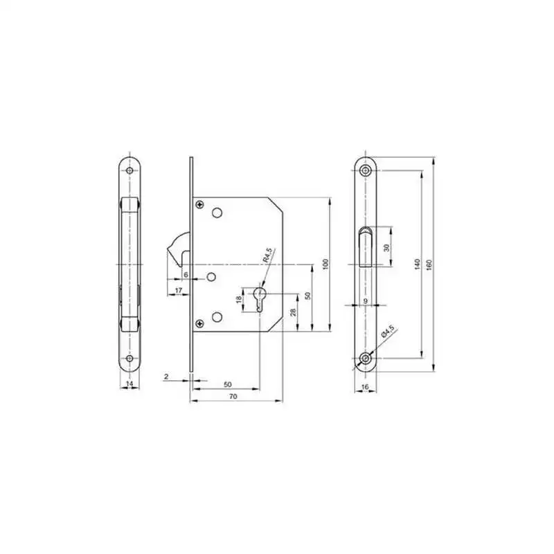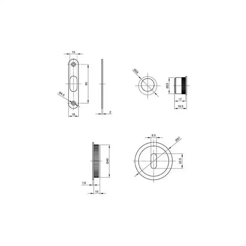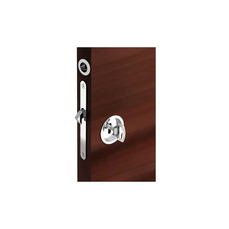 Serrure à crochet à encastrer avec poignées rondes et tire-doigt pour porte coulissante.
