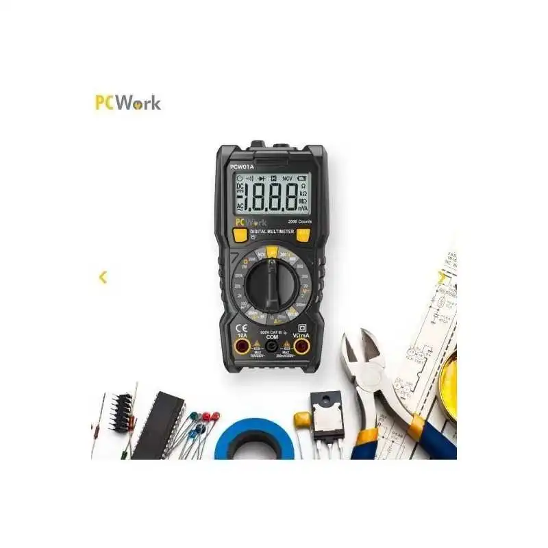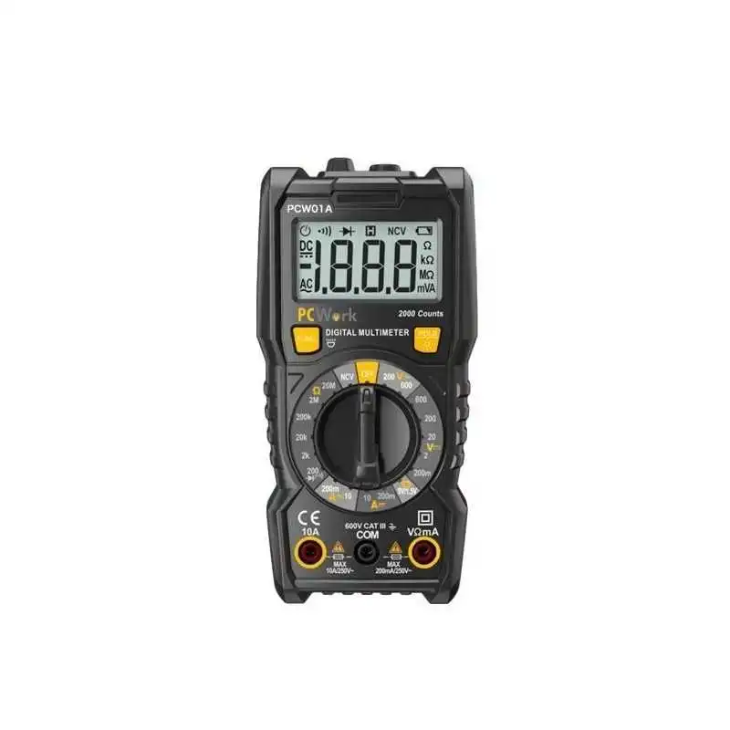 Test NCV (tension sans contact), continuité, batterie (1,5V/9V) et diode.