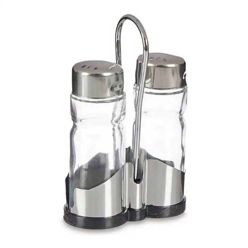-Les récipients pour le sel et le poivre sont en verre, ont un couvercle en acier inoxydable avec des trous et sont organisés sur un support en acier inoxydable.