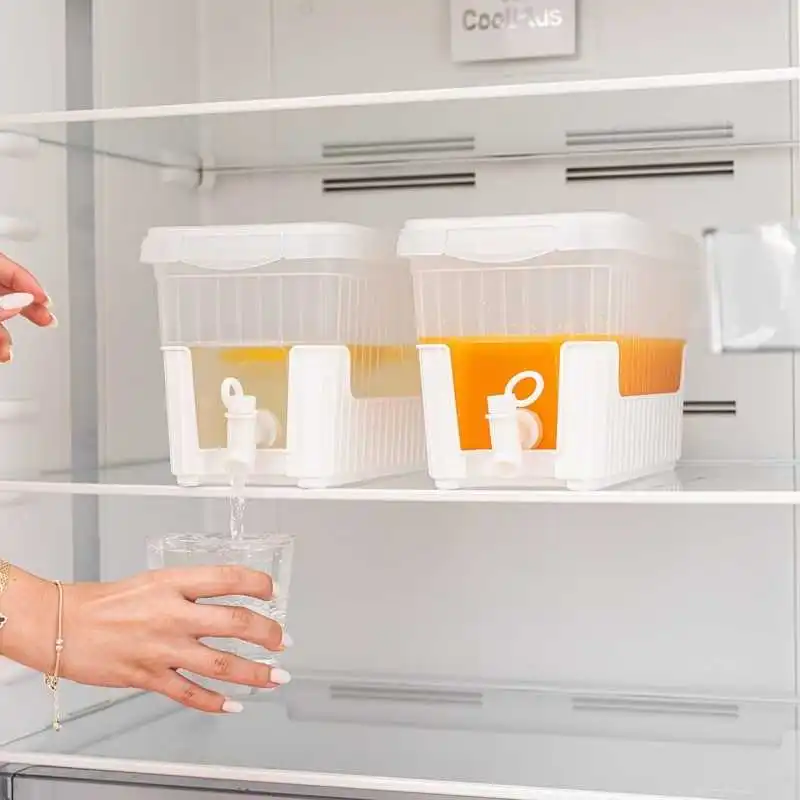 -Distributeur en plastique avec robinet et base pour utilisation à l'intérieur et à l'extérieur du réfrigérateur.