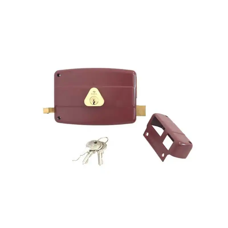 Serrure en applique Sûreté à cylindre rond Cisa Serrure en applique horizontale 1 point, coffre et gâche en acier, peinture damask rouge. L x H x E : 140 x 96 x 25 mm. Axe clé : 70 mm. Largeur du pêne 1/2 tour de 18 mm (rep. F). Largeur de la gâche de 36 mm (rep. G). Largeur du pêne dormant de 35 mm (rep. P). Longueur du canon de 40 mm (rep. C)"