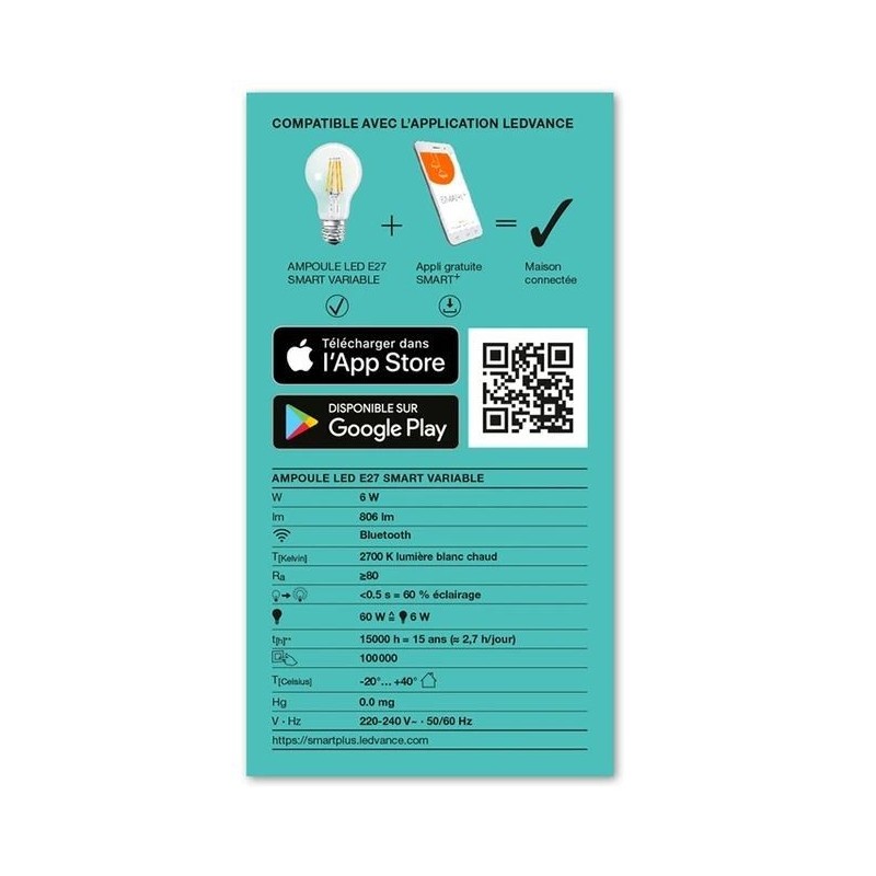 -Contrôlable via l'application LEDVANCE SMART+ (avec minimum Android 6.0 ou iOS 11.0).