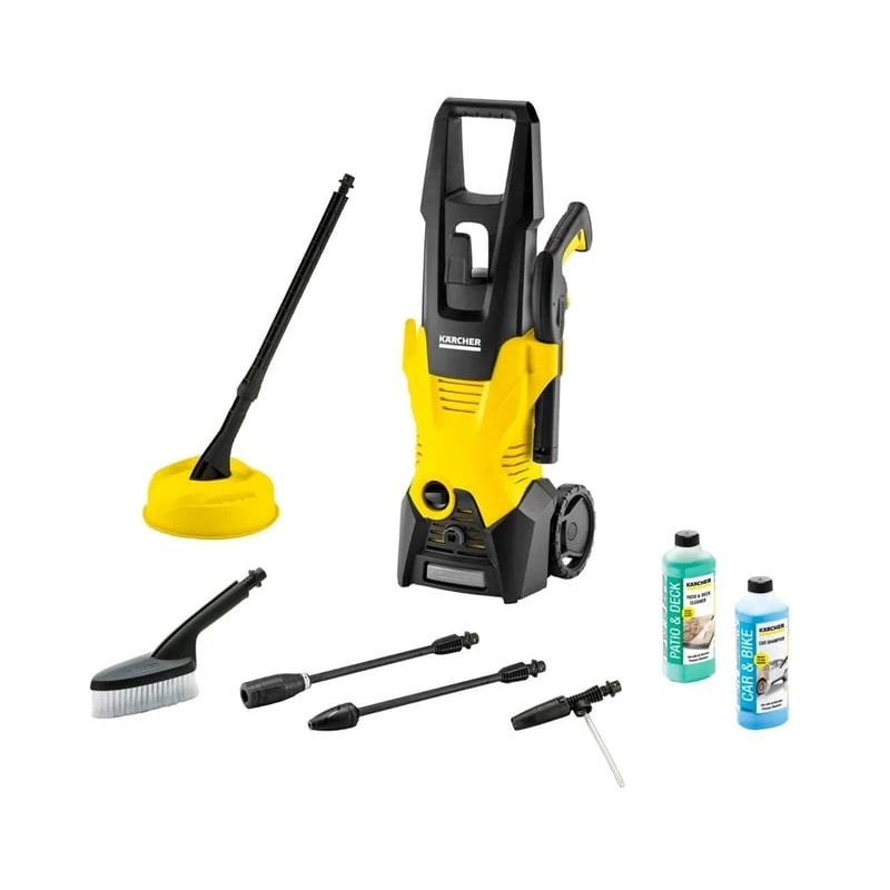Le Kit Home contient le nettoyant sols durs T 150 et 500 ml de détergent « Patio & Deck ». Autres équipements : deux roues maniables, un flexible haute pression de 6 mètres, une rotabuse avec jet rotatif pour les saletés incrustées, un filtre à eau protégeant la pompe de toute pénétration d’impuretés, une base solide et une poignée télescopique escamotable.
