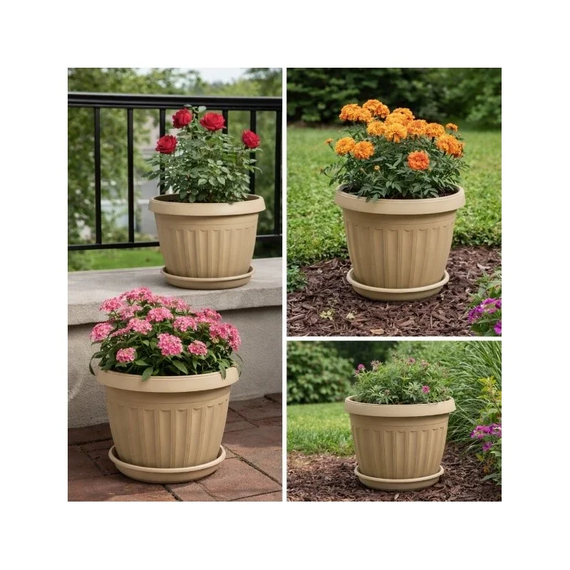 pot de fleur rond en plastique robuste, conçu pour un usage intérieur et extérieur
