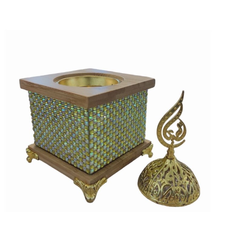 -Très joli encensoir en bois avec couvercle métal doré, ce bruleur d’encens métallique doré un côté oriental à votre décor.