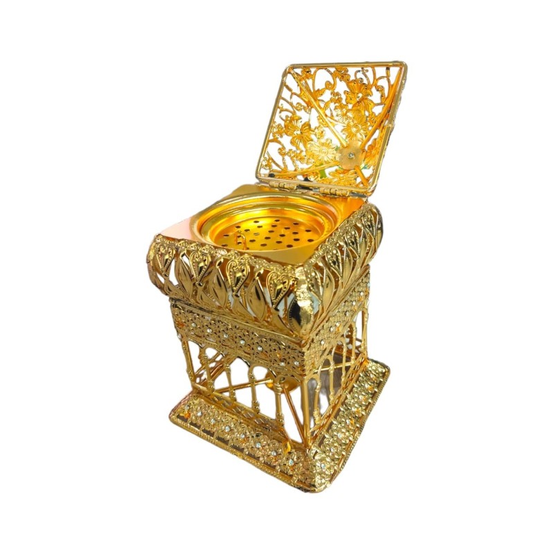 Bel encensoir métallique doré décoré avec des 'diamants' blancs, le couvercle du haut est assortie diamant rond.