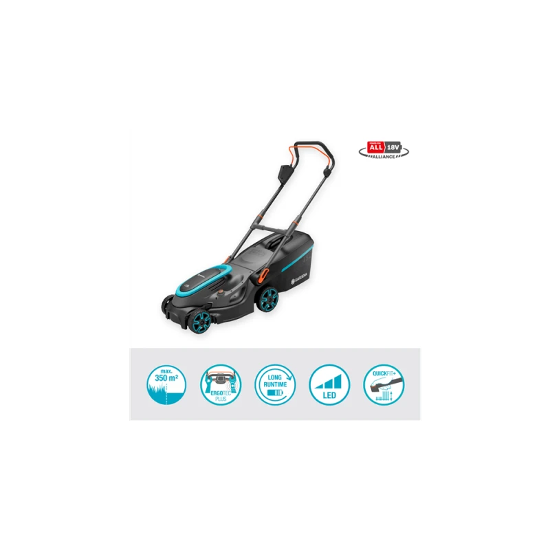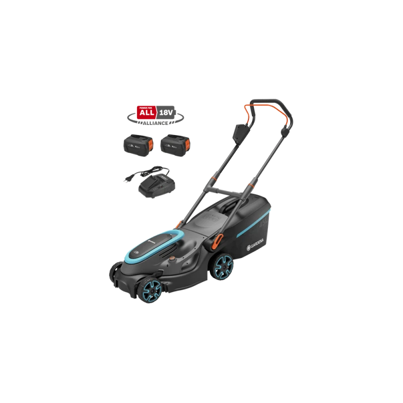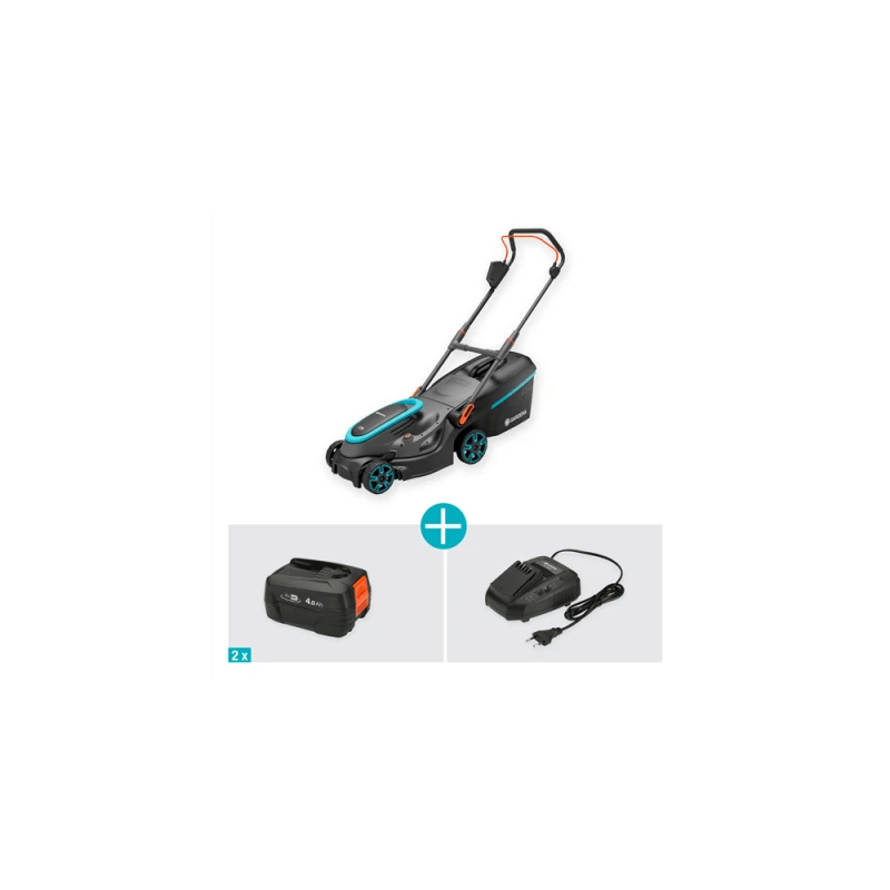 La tondeuse à batterie PowerMax 37/36V P4A est livrée en kit prêt à l'emploi avec un chargeur rapide et deux puissantes batteries 18V POWER FOR ALL de 4,0 Ah.