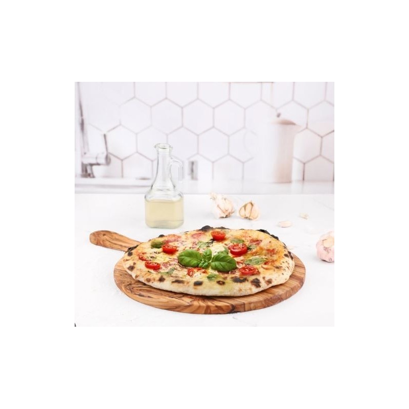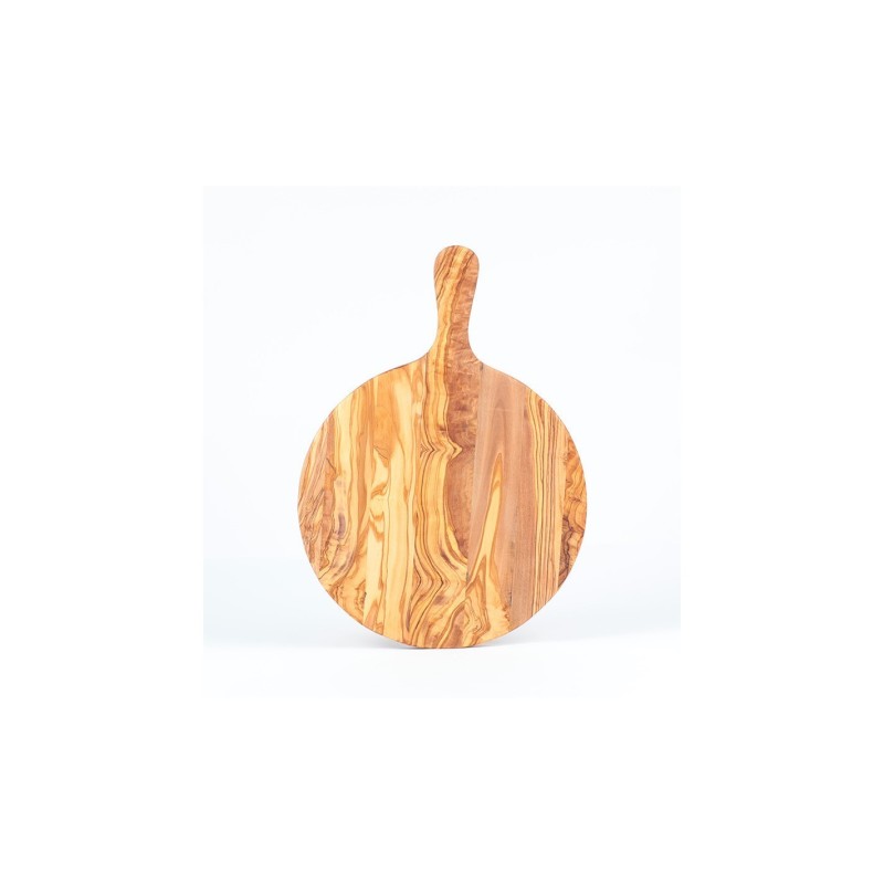 Cette grande planche ronde en bois d'olivier est un très bel ustensile pour servir vos pizzas.