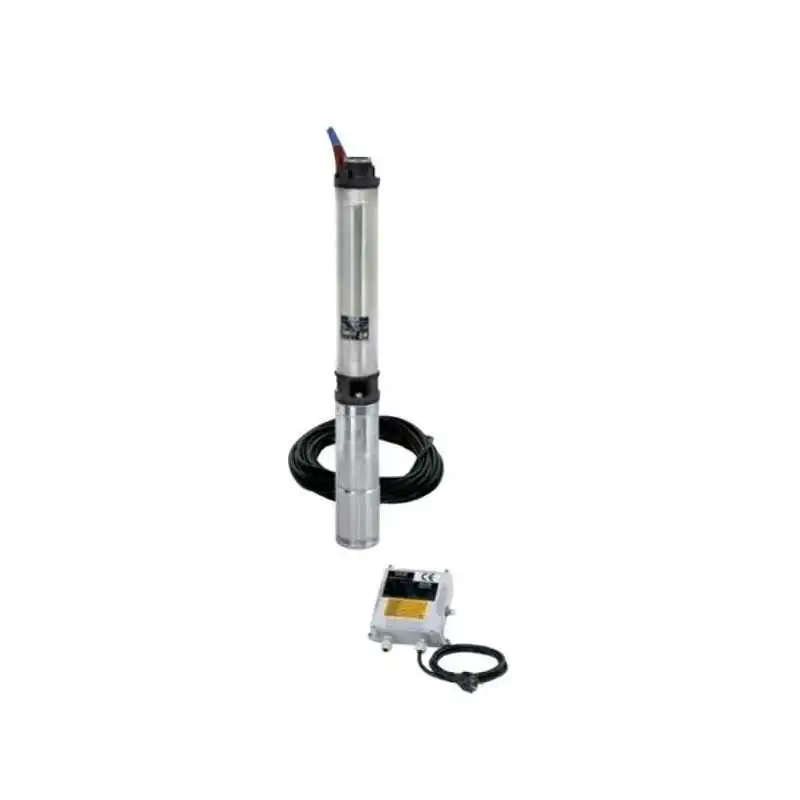 Électropompe submersible, centrifuge et multicellulaire, pour les puits de 4" ou plus, capable de produire une vaste gamme de débits et de hauteurs d'élévation. Elles peuvent être utilisées pour de nombreuses applications de levage, pressurisation et distribution, dans les installations civiles et industrielles, l'alimentation d'autoclaves et citernes, la lutte contre les incendies, les installations de lavage et d'irrigation. Caractéristiques de construction : Support de base (avec filtre intégré) et tête supérieure (avec clapet anti-retour intégré) en techno polymère. Cache de câble en plastique. Moteur électrique TESLA submersible, rempli d'huile, à deux pôles, construit entièrement en acier inoxydable AISI 304 pour les parties en contact avec l'eau. Stator rebobinable. Le condensateur et la protection contre les surcharges à réinitialisation manuelle se trouvent dans le coffret de contrôle. Protection de l'utilisateur pour la version triphasée. Avec coffret de contrôle, câble de 15 ou 30 m (selon les modèles) et cordon de sécurité. Liquide pompé : propre, sans substances solides ni substances abrasives, chimiquement neutre et proche des caractéristiques de l'eau.