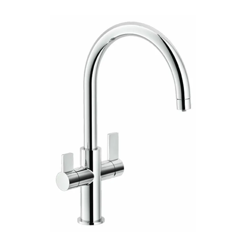 Mitigeur d’évier design Cigogne Nobili chromé a 3 sorties sans douchette, avec un jet d'eau simple.