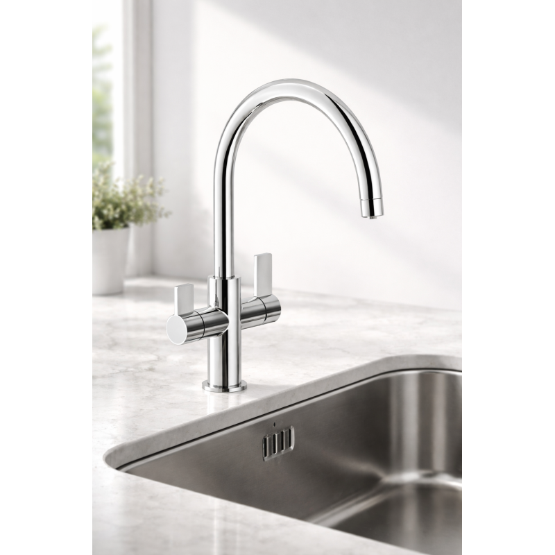 Le mitigeur évier cigogne 3 sorties Nobili séduit par son design moderne et sa silhouette haute en col de cygne, idéale pour laver facilement les grands plats et remplir marmites ou casseroles sans contrainte.