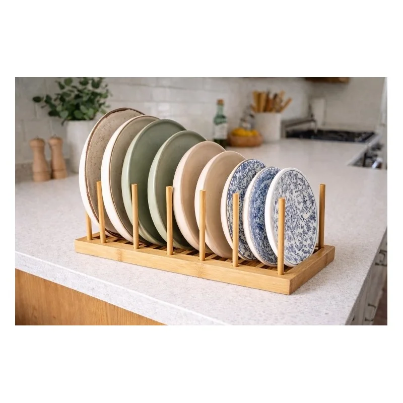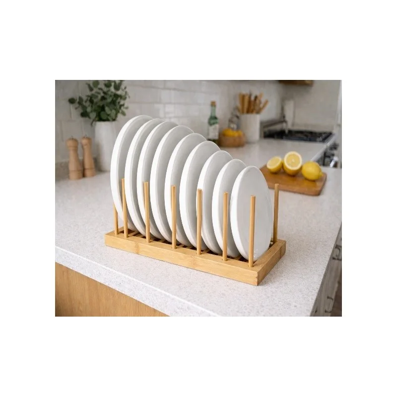 Conçu pour accueillir jusqu’à 6 assiettes, ce support en bois robuste permet un rangement vertical optimisé.