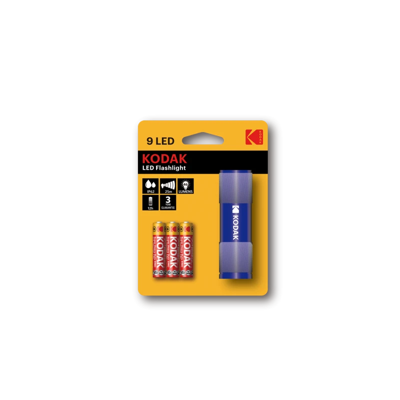 Kodak 9-LED lampe de poche bleu + 3x AAA pile lampe de poche Kodak en aluminium à 9 DEL de haute qualité est une petite lampe de poche de haute qualité.Cette lampe de poche a un indice de protection IP62, cela signifie que cette lampe de poche est résistante aux intempéries. Lampe de poche 9-LED en aluminium résistant aux intempéries Haute qualité et fiabilité. 46 Lumen - 1 Watt. Couleur : bleu