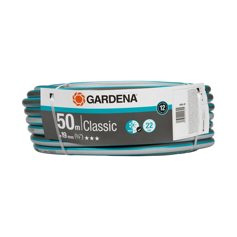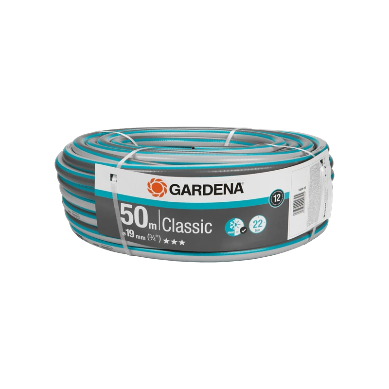 -Le tuyau CLASSIQUE 19 mm (3/4") de GARDENA mesure 50 m de long avec un diamètre de tuyau de 19 mm (3/4").