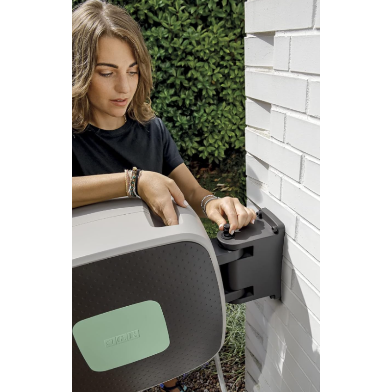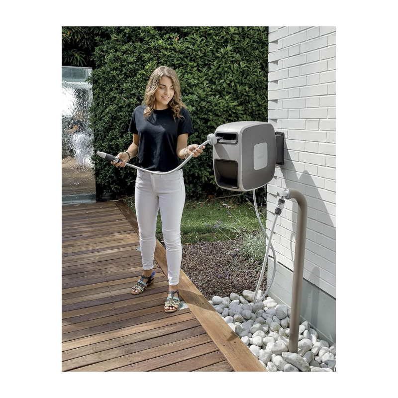 Fixé au mur, il permet de rembobiner automatiquement et confortablement le tuyau sans effort.