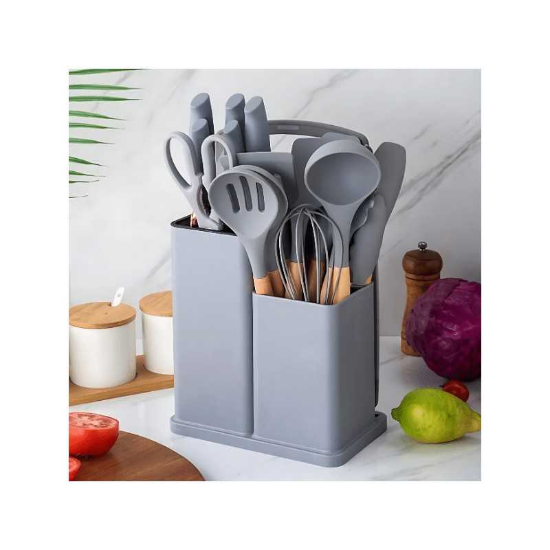 Ensemble d’accessoires de cuisine de 19 pièces en silicone résistant à la chaleur avec poignée en bois , seau de rangement et planche à découper.